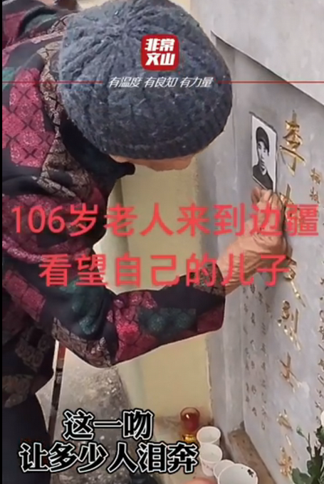近日,106岁奶奶奔波400多公里到麻栗坡烈士陵园,看望40多年前为国捐躯,长眠在这里的独子—李加友烈士。奶奶跌跌撞撞走向儿子的墓碑,亲吻墓碑上的照片……
