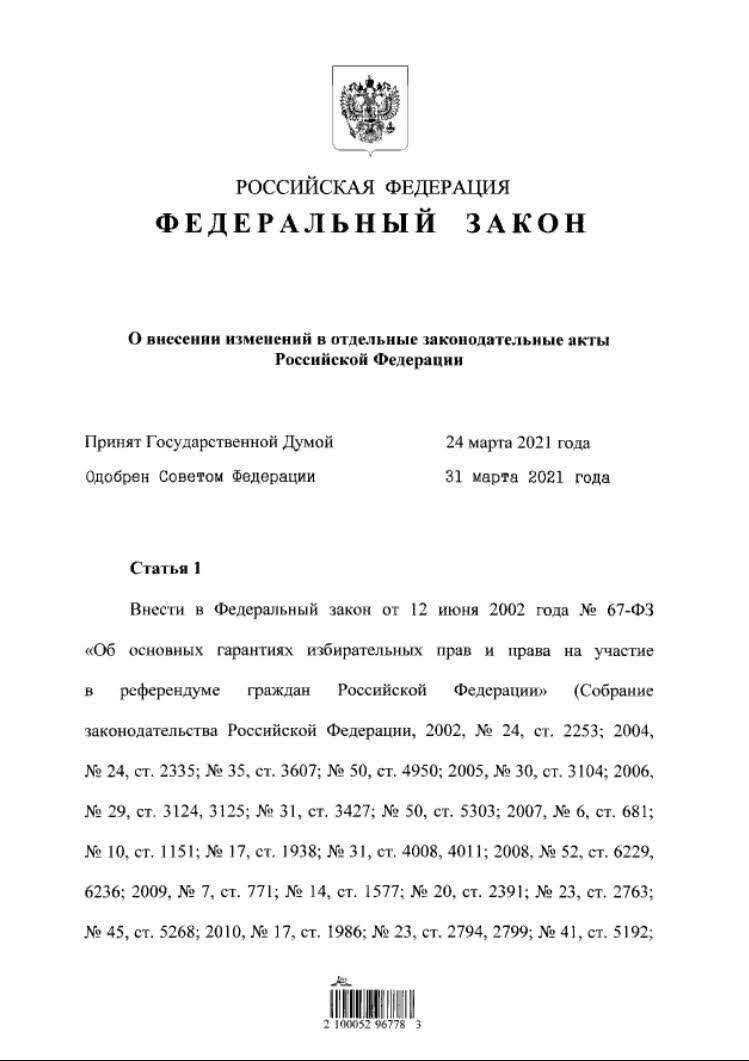 2020年,俄罗斯对宪法进行修改,根据修宪结果制定了一系列新法案。其中一项法案允许现任国家元首再担任两届总统。3月31日俄罗斯联邦委员会(上院)二读通过了该法案。