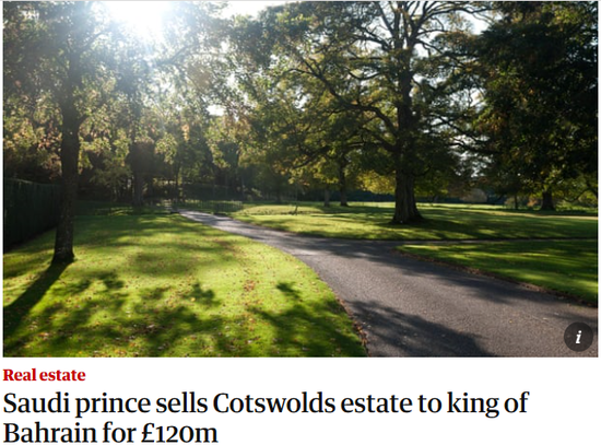 星岛环球网消息:海外网4月6日电 英国《卫报》5日报道称,沙特王子班达尔·本·苏丹将自己在英国最美乡村科茨沃尔德的一大片地产,出售给巴林国王哈马德·本·伊萨·阿勒哈利法,售价超过1.2亿英镑(约合11亿元人民币)。