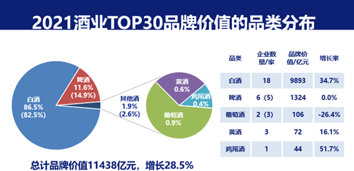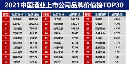 榜单显示,国内酒业TOP30上市企业的总品牌价值已高达11438亿元,同比增长28.5%。