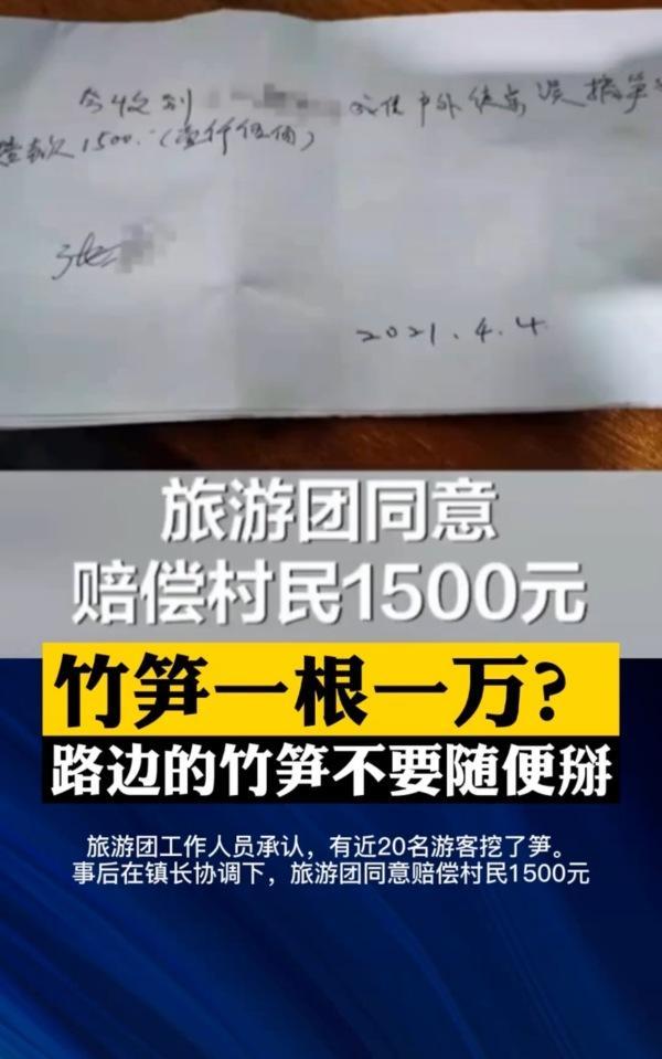 4月4日,正值清明小长假,一旅游团到四川成都成佳镇游玩时,几名游客擅自将当地村民的竹笋挖走,双方就赔偿一事发生了争执。村民索赔时要价一根竹笋一万元,游客认为村民漫天要价,趁机敲诈勒索。