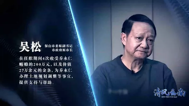 其中,保山市委原副书记、市长吴松在任职期间4次收受乔永仁送给的人民币200万元,以及价值27.75万元的金条2根,为乔永仁办理兴盛农产品市场土地规划调整等事宜提供支持与帮助。
