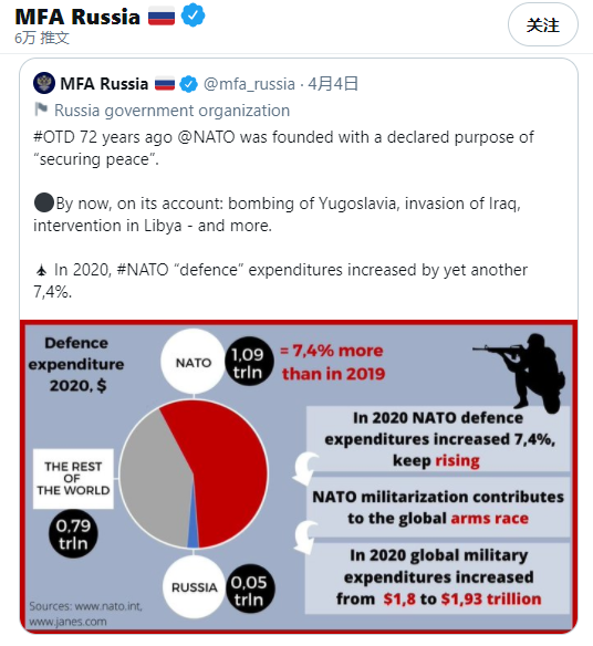 有趣的是,俄外交部4日还在推特上发文,别样地“庆祝”了北约的诞辰。