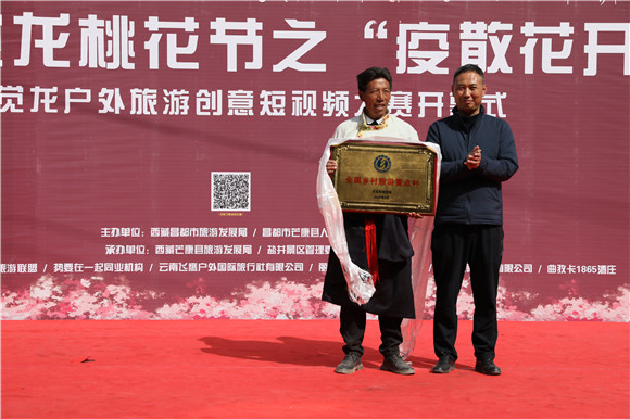 华龙网-新重庆客户端4月4日11时讯 十里桃花、茶马古道、雪山温泉、千年盐田、生态美食……人间四月芳菲尽,觉龙桃花始盛开。4月3日,由西藏芒康县人民政府、西藏昌都市旅游发展局主办,芒康县旅游发展局、盐井景区管委会承办的“第四届觉龙沟桃花节之‘疫散花开.春暖觉龙’暨首届觉龙沟户外旅游创意短视频大赛”在纳西民族乡觉龙村开幕。2020年9月觉龙村被国家文化和旅游部评选为全国乡村旅游重点村。开幕式上,芒康县委书记齐应海为觉龙村“2020全国乡村旅游重点村”称号授牌。