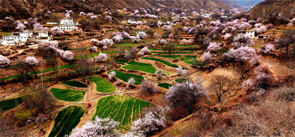 觉龙沟桃花从2600米的沟底绵延攀升到3100米,落差达500米,桃花由低到高依次开花,花期分明,周期漫长,与周边的藏式民居相互映衬,一眼望去,十里桃林,恍如“世外桃源”;近观细看,花前月下,远观俯视,春冬交融,冰雪与桃花遥相呼应,麦田与桃林相辉呼应,溪水绵延盘旋在桃林中,均令人回味无穷。