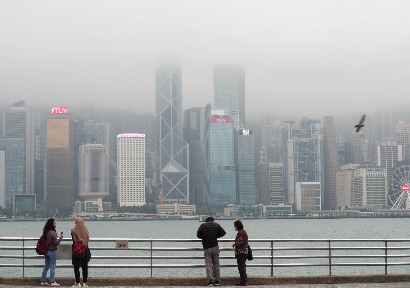 3月7日,香港维港两岸雾色苍茫,从尖沙咀眺望港岛中环海市蜃楼。(香港中通社)