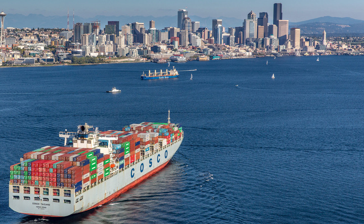 这张未标明拍摄日期的资料照片显示的是一艘中远海运货轮驶向美国华盛顿州西雅图港口。新华社发(美国西雅图港供图)