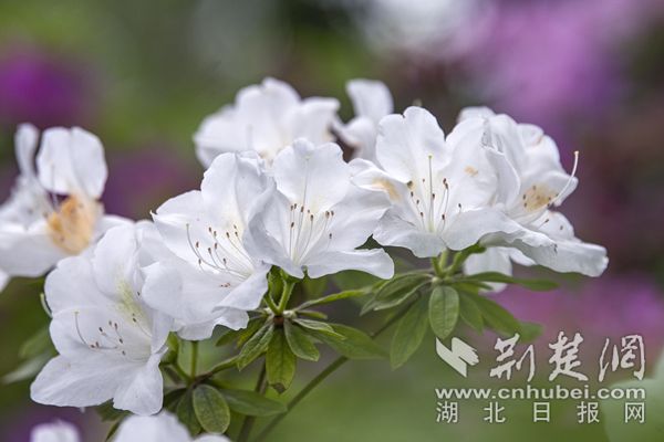 杜鹃花色艳丽,武汉植物园的杜鹃除红色、紫色、粉色、白色等单色外,还有绿色杜鹃和复色杜鹃花。从国外引进的绿色杜鹃品种“绿色光辉”,花朵小巧玲珑,色如碧玉,十分罕见。复色杜鹃“皇冠”花朵白粉相间,粉红色镶边,素雅又不失颜色,一扫杜鹃的艳丽姿态,既清新又迷人。