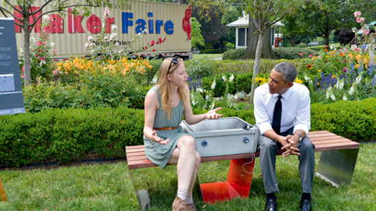 2014年6月,在白宫举办的“创客嘉年华”上,美国总统奥巴马饶有兴趣地坐在Soofa上听着Changing