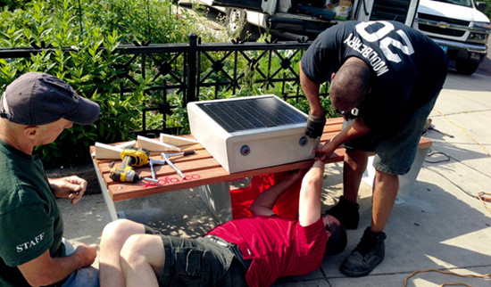 工人正在安装Soofa,它除了装有太阳能充电设备,还遍布传感器。