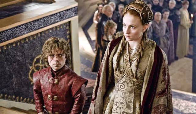 ▲图注:珊莎的第一次合法婚姻,对象是小恶魔提利昂,迄今只有重婚,未曾离异