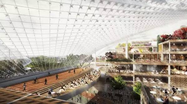 设计提案充满了有关未来工作场所的奇思妙想。园区内有适合协作办公的空间。也有私密的办公空间,员工可以在这里打开手提电脑工作,而不受干扰,也没有刺眼的阳光。谷歌员工还可以骑自行车上班,甚至直接骑到自己的办公桌前。停车场在地下,不会影响景观。在俯瞰中庭的巨大露台上还设有健身器材和瑜伽馆,不过奇怪的是效果图上没有显示栏杆及其他的安全设施。或许在玻璃罩下重力也会不同?一层是咖啡馆和商店,谷歌还计划在附近建造5000套住宅,骑着躺式自行车就能轻松往返,所有员工可能一辈子都不用离开园区。