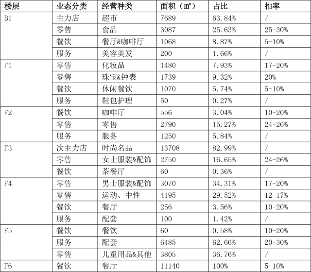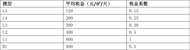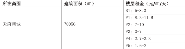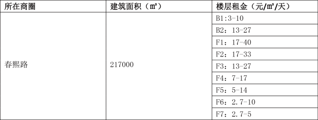楼层差异:各楼层租金差异相对不明显,主要影响因素来自具体位置及品牌度等,同业态租金各楼层变动幅度约在50%以内;