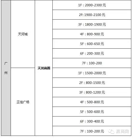 天河商圈,一楼租金2000-2300元/㎡/月,二楼租金1900-2100元/㎡/月,三楼租金1800-1900元/㎡/月,四楼租金800-900元/㎡/月,五楼租金600-650元/㎡/月,六楼租金200-300元/㎡/月,七楼租金100-200元/㎡/月。