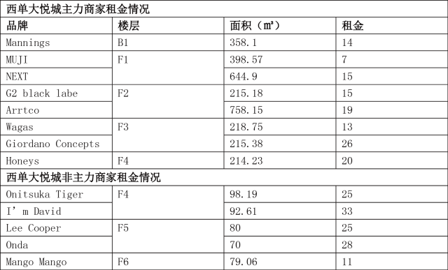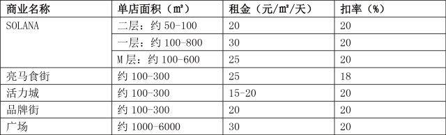 项目按不同的区位将商业功能划分为美瑞时尚百货、活力城主题店、品牌街、亮码头酒吧街、亮马食街、中央广场等区域,从上述租金明细来看,5大区域租金相差不大,扣率基本一致。