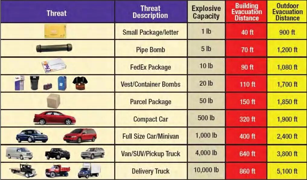 上图是用来指示遇到不同爆炸物危险时候,需要疏散人群的距离。每磅lb相当于0.45公斤,每英尺ft相当于0.3米。红色距离表示需要疏散建筑物,黄色标识需要疏散路上人群的范围。