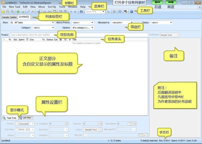 8.修改任务列表:(设置完成进度,开始计时等) F2 -> <输入新的标题> -> 回车 -> Tab -> <修改相应的任务属性> (Ctrl + 方向键,调整任务位置或层级);