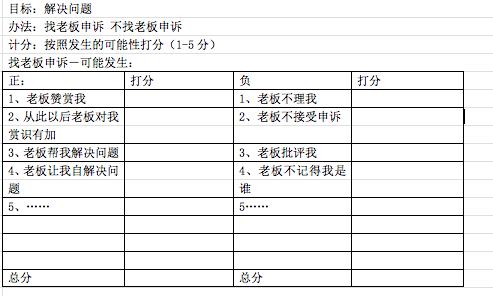 首先,你要确定你的目标。由于不知道你到底要找老板申诉什么,不过猜测你是要解决一个问题。所以你的目标其实是解决问题。定好目标后,你可以尝试做选择矩阵。