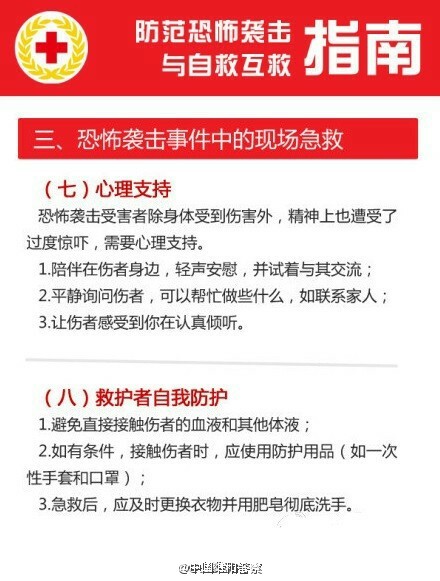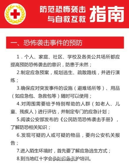 遇到恐怖袭击时,第一件要作的就是冷静,因为人在慌乱的情况下,不能做出正确的环境判断。