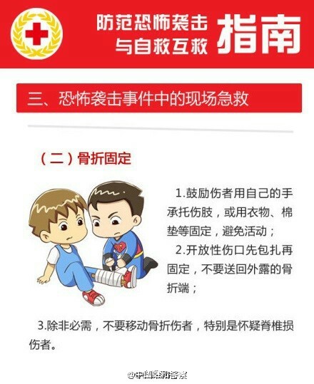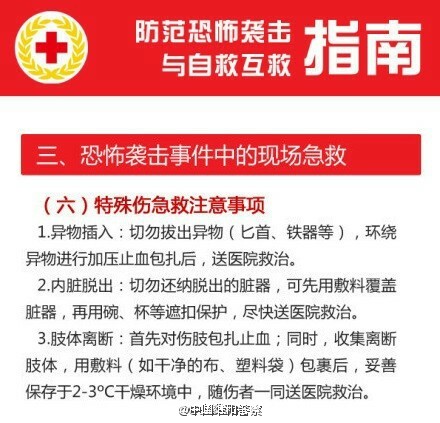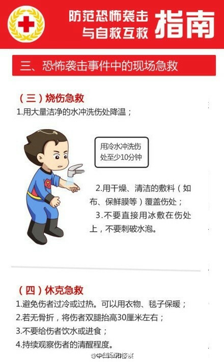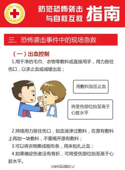 遇到恐袭,个人如何应对? Sutton 2015年11月14日 看到巴黎的事情,想到之前国内的昆明事件,十分想了解个人如何应对恐怖袭击。 跟帖 | 0条内容 添加图片 发布 fx忙碌 2015年11月14日 逃跑。“最想说的放在前面,那就是不要太相信影视作品给你的任何所谓常识。空手夺白刃什么的事情,永远只在屏幕里,和你没有关系;人在跑,子弹永远在身后打不到,那也只是屏幕上的演绎。真实的世界就是那么残酷,生命就是那么脆弱,不要逞英雄,在感知到发生危险的时候,你能做的最好选择,就是逃离。”——这是一篇KnewOne的微信文章,详细的讲了个人应对恐怖袭击的方法。题主可以搜索查看一下。 回复 19 Gary哎呦喂!! 2015年11月14日 第一时间就是run。 回复 1 11 随风121 2015年11月16日 跑不掉怎么办 回复 0 肖生克的舅叔 2015年11月14日 到隐蔽的地方 回复 11 DemiseYoung 2015年11月14日 先保护自己。上海的地铁里贴有相关的图片的,告知大家如果遇到紧急情况,应该如何自救。我觉得这样的知识的普及很重要。以下转自“中国维和警察”微博:#警方提醒#【遇恐怖袭击时,谨记三准则:逃!躲!战!】①能跑先跑、报警并在不会过度拖慢你速度情况下拉上其他人②跑不了就藏起来锁好门,手机静音③藏不住就只能死磕!有时,我们只能依靠自己的知识和肉体。记住这三条:RUN!HIDE!FIGHT!分享给你关心的人 O网页链接以下转自一财: 恐怖袭击的方式多样化,但大多数恐怖袭击都是发生在人多的、不易疏散的地方,比如地铁、地下通、公交车内、火车站、机场等地,而恐怖袭击的方式也很多,而都有一个共性,那就是伤害过程简单迅速。下面就来讲讲恐怖袭击发生后,应如何自我保护。1.遇到被恐怖分子劫持后怎么办? (1)保持冷静,不要反抗,相信政府; (2)不对视,不对话,趴在地上,动作要缓慢; (3)尽可能保留和隐藏自己的通讯工具,及时把手机改为静音,适时用短信等方式向警方(110)求救,短信主要内容:自己所在位置,人质人数,恐怖分子人数等; (4)注意观察恐怖分子人数,头领,便于事后提供证言; (5)在警方发起突击的瞬间,尽可能趴在地上,在警方掩护下脱离现场。 2.地铁内爆炸怎么办? (1)迅速按下列车报警按钮,使司机在监视器上获取报警信号; (2)依靠车内的消防器材进行灭火; (3)列车在运行期间,不要有拉门、砸窗、跳车等危险行为; (4)在隧道内疏散时,听从指挥,沉着冷静、紧张有序地通过车头或车尾疏散门进入隧道,向邻近车站撤离; (5)寻找简易防护物、如衣服、纸巾等捂鼻,采用低姿势撤离。视线不清时手摸墙壁撤离; (6)受到火灾威胁时,不要盲目跟从人流相互拥挤、乱冲乱摸,要注意朝明亮处,迎着新鲜空气跑; (7)身上着火不要奔跑,就地打滚或用厚重衣物压灭; (8)注意观察现场可疑人、可疑物,协助警方调查; (9)在平时乘坐地铁时要注意熟悉环境,留心地铁的消防设施和安全装置。 3.遇到化学恐怖袭击怎么办? (1)不要惊慌,进一步判明情况。化学恐怖袭击多为利用空气为传播介质,使人在呼吸到有毒空气时中毒。常伴有异常的气味,异常的烟雾等现象; (2)尽快掩避。利用环境设施和随身携带的物品遮掩身体和口鼻,避免或减少毒物的分割侵袭和吸入; (3)尽快寻找出口,迅速有序地离开污染源或污染区域,尽量逆风撤离; (4)及时报警,请求救助。可拨打110、119、120报警; (5)进行必要的自救互救。采取催吐、洗胃等方法,加快毒物的排出; (6)听从相关人员的指挥; (7)配合相关部门做好后续工作。 4.遇到纵火恐怖袭击怎么办? (1)忌惊慌失措。 不可惊慌失措,盲目逃跑或纵身跳楼。要保持冷静,尽快了解所处的环境位置、起火点、起火原因和火势大小,正确选择逃生方法和路线; (2)忌盲目呼喊。 现代建筑物燃烧时会散发出大量的烟雾和有毒气体,容易造成毒气窒息死亡。可用湿毛巾捂鼻口,匍匐前进逃离,紧急时刻呼叫时也不能移开毛巾; (3)忌贪恋财物。 不要为穿衣或取贵重物品浪费时间,更不要为入室拿物品而重返火海; (4)忌乱开门窗。 如房间充满烟雾,必须时,可打开门窗,排放烟雾后,应立即重新关闭好,防止长时间开窗致使外面大量浓烟涌入室内,能见度降低,高温和毒气充斥,无法藏身; (5)忌乘坐电梯。 一旦着火,电梯就会断电,可能将你困在电梯,无法逃生; (6)忌随意奔跑。 随意奔跑,不仅容易引火烧身,还会引起新的燃烧点,造成火势蔓延; (7)忌轻易跳楼。 在房间无法避难时,也不要轻易做出跳楼的决定,此时可扒住阳台或窗台翻出窗外,等待救援。 注意事项 遇到恐怖袭击时,第一件要作的就是冷静,因为人在慌乱的情况下,不能做出正确的环境判断。 回复 25