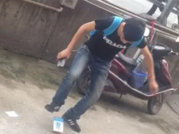 图为美团员工在广州踩踏支付宝广告牌视频截图↓