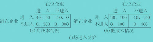 在市场进入博弈中,精炼贝叶斯均衡是:在位企业产品定价较高,潜在企业推断其为高成本,选择进入;在位企业产品定价较低,潜在企业推断其为低成本,选择不进入。