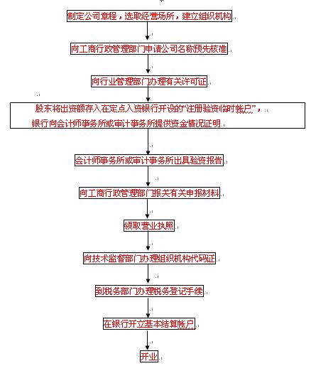 1、制定公司章程,选取经营场所,建立组织机构。