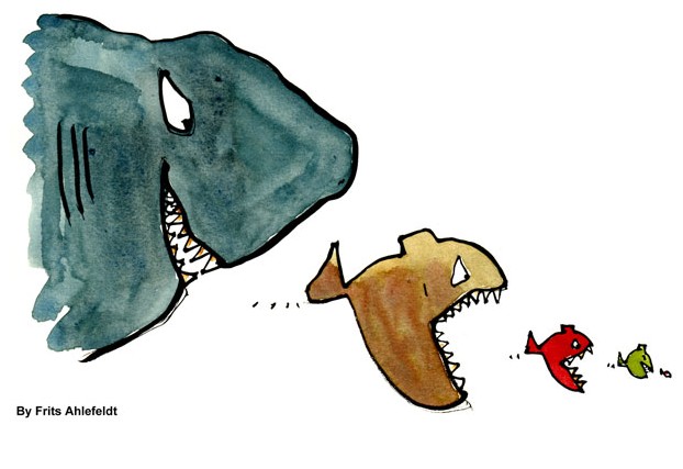 青岛海尔集团的老总张瑞敏认为,在市场经济发达的国家,企业的兼并经过三个阶段:第一个阶段是大鱼吃小鱼,亦即弱肉强食;第二个阶段是“快鱼吃慢鱼”,技术先进的企业吃掉落后的企业;第三个阶段是鲨鱼吃鲨鱼,亦即强强联合。而在目前的中国,国企之间的兼并却不会出现这三种情况,因为是国有的,企业只要有一口气,就不会被吃,且“小鱼不觉其小,慢鱼不觉其慢,各得其所”。“死鱼”就根本不能吃。这是中国的国情决定的。