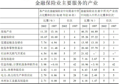 然而相比年第三产业的这一地位有所下降。看表,在1997年最需金融保险业提供服务的10个产业中第三产业占6个,比1997年少2个;更为重要的是,在1997年金融保险业有63.02%的中间产品提供给第三产业,大大高于第二产业的33.78%和第一产业的3.20%。进一步分析,对于2002年金融保险业提供服务最多的6个第三产业,它们对金融保险业也非常依赖。如下表中,2002年金融保险业在6个第三产业的中间投入的比重都较大,位次都居前5名。