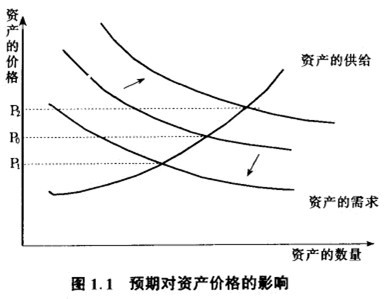 图中P0为预期瞬时的资产均衡价格,当需求者预期价格将下跌时,需求曲线向左下方移动,提前形成反映未来的价格P1<P0;相反,当需求者预期金融资产价格将上升时,需求曲线向右上方移动,提前形成反映未来的价格P2>P0。