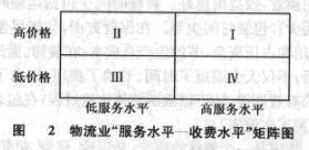 (7)增值服务。随着人们对物流科学的认识不断发展,物流系统的目标也会随着市场、环境变化而做出调整。为了能够直观地分析增值服务的内容,我们构造了“物流业服务水平——收费水平”矩阵图(见图2)。