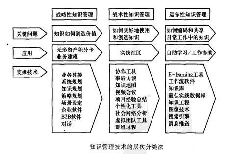 层次分类法从知识管理的不同层次来分类知识管理技术。知识管理对企业运营而言,在战略、战术以及运作三个层面上都能起到相应的作用,这样知识管理技术可分为三个层面,即战略性知识管理技术、战术性知识管理技术以及运作性知识管理技术,如图所示。