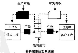在产品的生产过程中,熔化和热处理都必须以批量的形式进行,无法采用连续流动的方式进行。所以可以考虑引入超市拉动系统(参见物料超市拉动系统图),所谓物料超市拉动系统,也就是在必须以批量形式进行生产的工序和下游工序之间设置一个超市系统,通过下游工序从“超市”中取货而对上道工序发出生产指令,通过“取货看板”和“生产看板”的流动来拉动生产,摆脱生产控制部门对这些批量生产工序通过对客户工序进行预测而安排生产,由客户工序从超市中取货来决定上游工序在何时生产,生产多少。