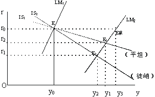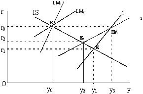 图1中,曲线斜率相同,曲线斜率不同,假定开始的均衡收入和均衡利率都为roYo。政府货币当局实行增加同样一笔货币供给量△M的扩张性货币政策时,LM都右移相同距离EEH,这里k是L=kY-hr货币需求函数中的,即货币交易需求量与收入之比率,YoY3等于ro利率不变时因货币供给增加而能够增加的国民收入,但实际上收入并不会增加那么多,因为利率会因货币供给增加而下降,因而增加的货