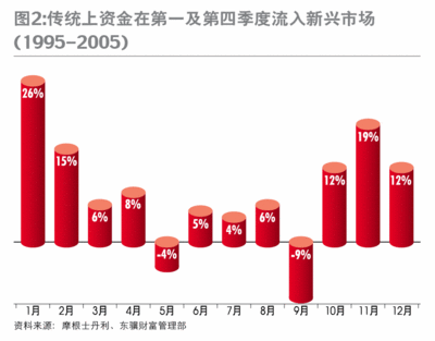因此,金砖四国的经济仍会维持一段长时间的高增长。在这个大趋势下,四国的股市和货币都应该有理想表现。事实上,除了印度股市市盈率达20倍外,其余三国都仅在14倍左右。由于美国经济放缓,油价明显回落,中国和印度将受惠于这一趋势,而且根据经验,资金在每年1季度和4季度会流向新兴市场(图2),中、印两国股市的走势值得关注。